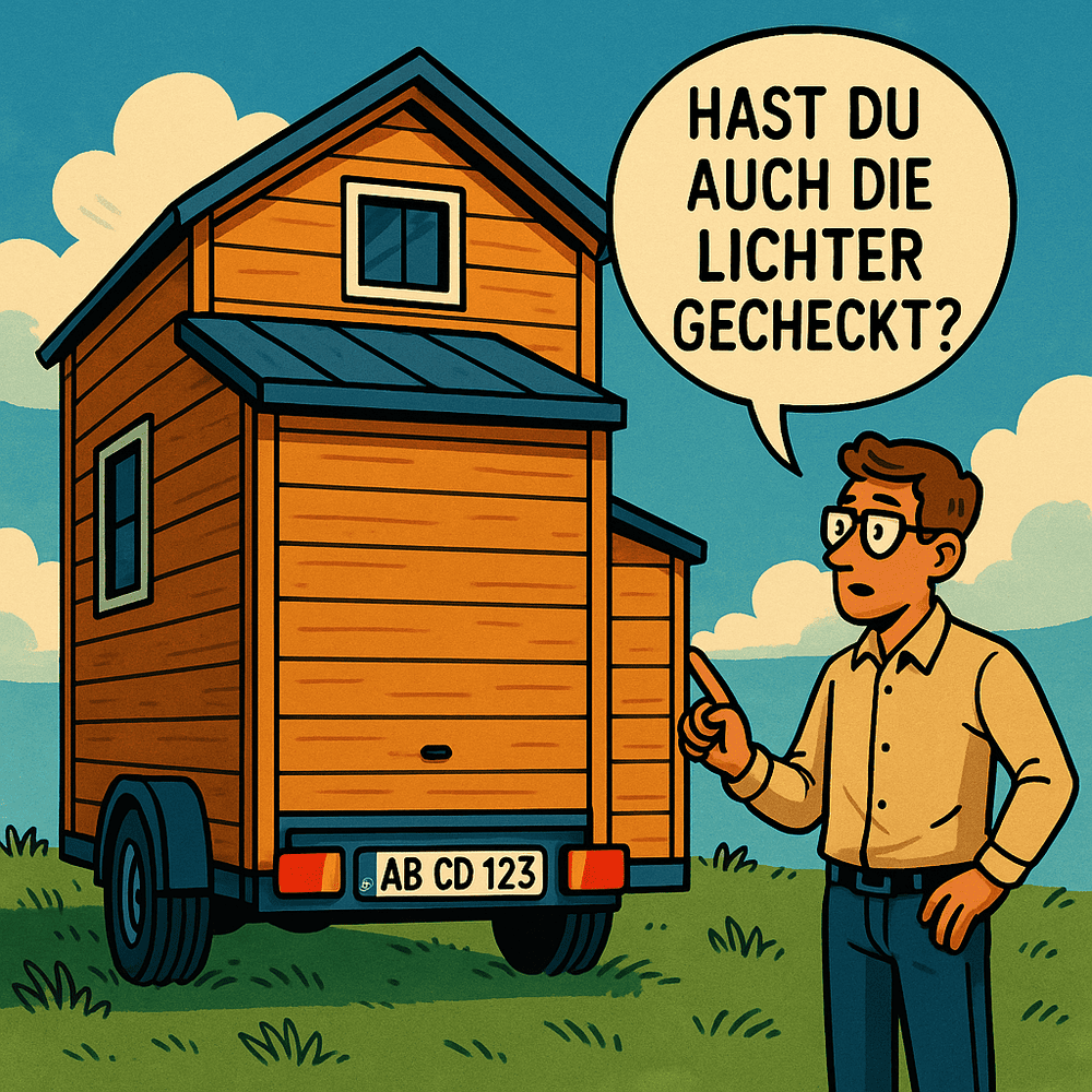 Bevor man seinen Tiny House Anhänger vom Gelände ziehen kann, sind ein paar Dinge bezüglich der Straßenverkehrstauglichkeit zu prüfen: Lichtertest, Wiegen, Anpassen der Stützlast und Ermitteln der Gesamtlast.