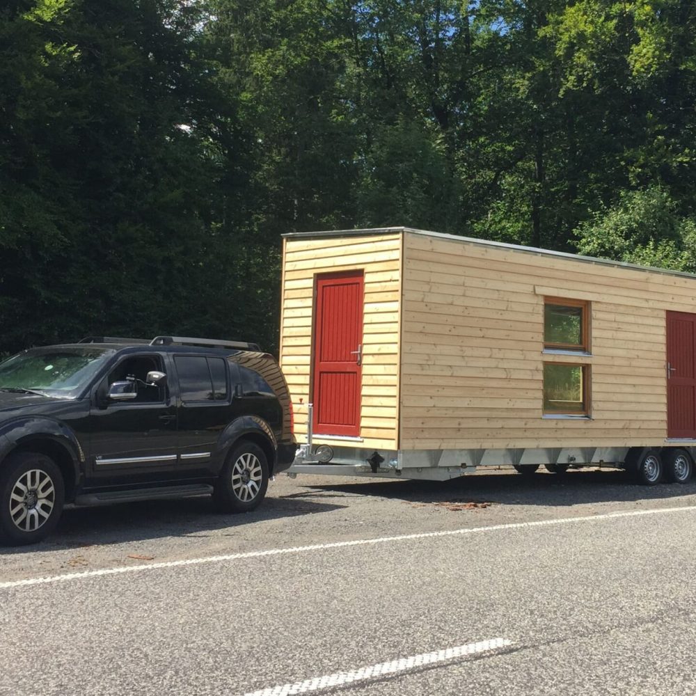 Die Überführung eines Tiny Houses kann ganz unterschiedlich aussehen, je nachdem, ob man mit einer Wechselbrücke oder einem Anhänger reist. Dementsprechend behandeln wir hier auch beide Fälle separat.